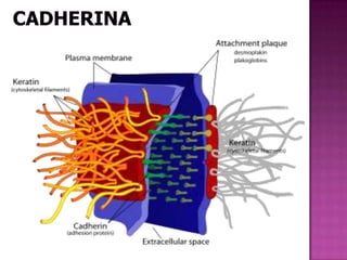La presentación trata sobre las diferenciaciones de la membrana celular y las interacciones entre células y matrices extracelulares. Explica las microvellosidades, uniones intercelulares como la unión oclusiva y uniones adherentes como desmosomas, hemidesmosomas, bandas de adhesión, puntos adherentes, contactos focales y uniones comunicantes. Finalmente, cita dos fuentes bibliográficas.