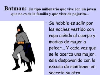 El documento analiza los perfiles psicológicos de varios héroes de caricaturas clásicas como Batman, Popeye, Pedro Picapiedras, El Increíble Hulk, Shaggy, Superman y Bugs Bunny. Se sugiere que estos personajes exhiben comportamientos como la homosexualidad, la personalidad múltiple, el abuso de sustancias, la agresividad y la violencia. Según el documento, estas caricaturas promovían estereotipos dañinos y normalizaban conductas psicológicamente problemáticas.