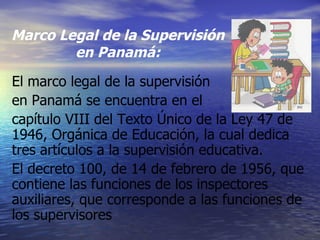 El documento resume el marco legal y las fases de la supervisión educativa en Panamá. Según la ley 47 de 1946 y el decreto 100 de 1957, la supervisión busca mejorar el proceso de enseñanza-aprendizaje a través de la investigación y el perfeccionamiento docente. Los supervisores deben realizar visitas periódicas a las escuelas. La supervisión ha pasado por tres fases: fiscalizadora, constructiva y creativa, enfocándose progresivamente en mejorar el aprendizaje de los estudiantes.