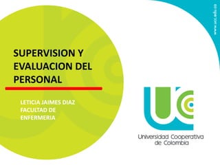 Este documento trata sobre la supervisión y evaluación del personal en enfermería. La supervisión busca mejorar la calidad de la atención, crear un ambiente favorable y optimizar los recursos. El supervisor establece un plan de supervisión, analiza el personal requerido, asigna tareas y realiza entrevistas y encuestas. La evaluación mide los atributos y desempeño del personal para mejorar su labor, rotarlos o capacitarlos. Se evalúan factores como calidad del trabajo e iniciativa. Existen métodos de evaluación basados en