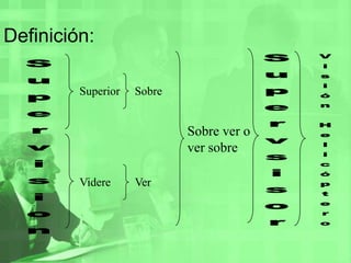 Este documento describe los principios y roles de la supervisión y los supervisores. Define la supervisión como la observación y registro de las actividades de un área de trabajo para asegurar el progreso hacia los objetivos. Explica que un supervisor dirige y evalúa el trabajo de otros empleados, y es responsable de tareas como planificar el trabajo, mejorar el rendimiento, y mantener buenas relaciones con los empleados. Finalmente, resume varios métodos de supervisión como el científico, no directivo, de ayuda mutua y de investigación activa.