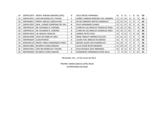 Este documento presenta los resultados de la Olimpiada del Conocimiento Infantil 2012 en la Supervisión Escolar 29 de Minatitlán. Se muestra el nombre de la escuela, grupo y alumno, así como sus calificaciones en diferentes materias y el total obtenido. El alumno con la calificación más alta fue Hannia Elizabeth Sánchez Rodríguez de la escuela Minatitlán con un total de 87 puntos. El documento está firmado por la supervisora escolar María Gracia López Nava.