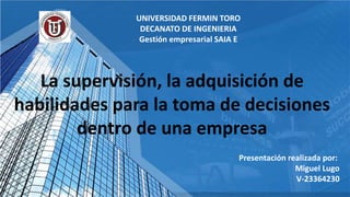Este documento presenta información sobre la supervisión en las empresas. En particular, define las funciones del supervisor como resolver problemas, apoyar a los empleados y no criticarlos constantemente. También describe tres estilos de supervisión (autocrático, democrático y liberal) y los tipos de planes que pueden desarrollarse en una empresa como planes operativos, tácticos y estratégicos.