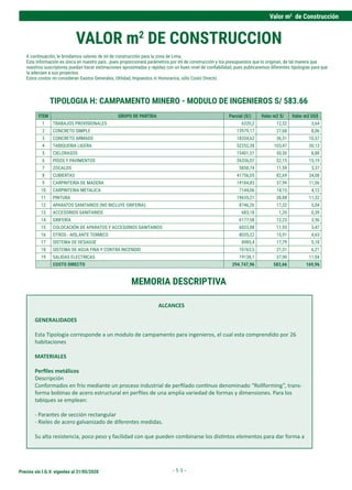 Este documento presenta los precios por metro cuadrado de construcción para diferentes tipologías en Lima, Perú, vigentes al 31 de mayo de 2020. Incluye un presupuesto detallado con los ítems, unidades, medidas y precios unitarios de partidas para un módulo de ingenieros de campamento minero. Además, contiene información técnica sobre los materiales y costos directos considerados, sin incluir gastos generales, utilidad ni impuestos.
