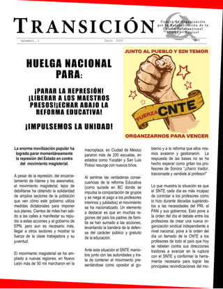 El documento destaca la movilización del movimiento magisterial en México, que ha logrado un apoyo popular a pesar de la represión estatal. A medida que el movimiento se expande, se plantea la necesidad de formar una nueva organización sindical independiente y se hace un llamado a una huelga nacional para oponerse a la reforma educativa y sus implicaciones privatizadoras. La unidad de trabajadores, estudiantes y padres es fundamental para avanzar en la defensa de la educación pública y los derechos sociales.