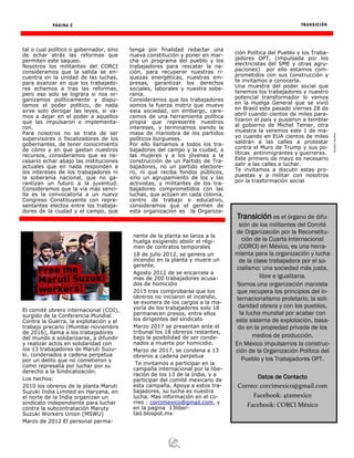 El documento aborda la difícil situación que enfrentan los trabajadores y el pueblo de México debido a las reformas estructurales impuestas por los gobiernos del PRI y PAN, que han resultado en menores derechos y mayores precariedades laborales. Además, se menciona la amenaza de las políticas de Donald Trump y la respuesta del gobierno de EPN, que se ha adaptado a dichas presiones, llevando a movilizaciones y protestas de los trabajadores que buscan unidad y una dirección política común. Finalmente, se propone la organización de un congreso constituyente con representantes de los trabajadores para luchar contra las reformas y construir una sociedad más justa e igualitaria.