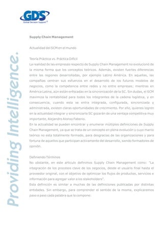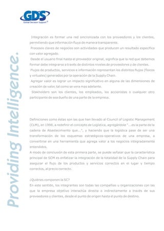 El documento describe la evolución del Supply Chain Management (SCM) a través de los años y las regiones. Explica que mientras las compañías en Estados Unidos y Europa se enfocan en integrar procesos internos y sincronizar la cadena de suministro, las compañías en Latinoamérica aún se enfocan en optimizar procesos internos. También destaca que el SCM maximiza la rentabilidad cuando la cadena de suministro está integrada, configurada y administrada de manera sincronizada.