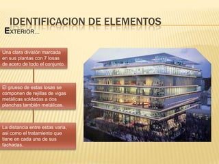 El documento describe la Mediateca de Sendai, diseñada por Toyo Ito en Japón entre 1998-2001. El edificio se compone de 7 plantas libres soportadas por 13 columnas metálicas de diámetros variables. Cada fachada tiene un tratamiento diferente de materiales como vidrio, policarbonato y aluminio. El interior crea espacios fluidos alrededor de la estructura tubular blanca, con usos como biblioteca, galería y cine distribuidos en las plantas.