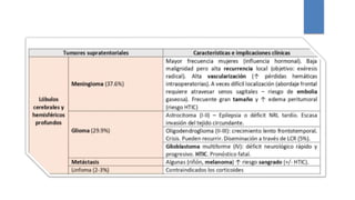 Este documento resume los aspectos clave de la anestesia para lesiones supratentoriales. Describe la evaluación preanestésica, incluida la clasificación de tumores cerebrales según la OMS de 2016. Detalla el manejo perioperatorio, incluida la monitorización, posición del paciente, fases de la anestesia y manejo hemodinámico. Finalmente, cubre temas como el mantenimiento con agentes volátiles para lograr estabilidad cardiovascular durante la cirugía.