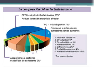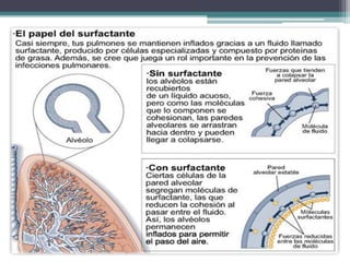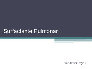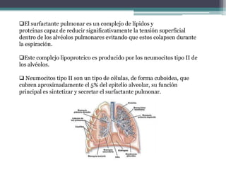 El surfactante pulmonar es un complejo de lípidos y proteínas producido por los neumocitos tipo II que reduce la tensión superficial dentro de los alvéolos pulmonares para evitar su colapso durante la espiración. Se compone principalmente de fosfolípidos como la dipalmitoilfosfatidilcolina y proteínas hidrofílicas y hidrofóbicas. Su función principal es mejorar la función y ventilación pulmonar al disminuir la tensión superficial alveolar.