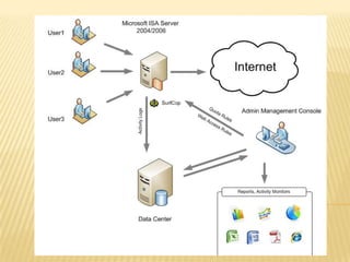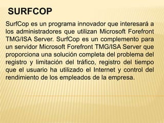 SurfCop es un complemento para Microsoft Forefront TMG/ISA Server que proporciona funciones como el registro y control del tráfico de red, registro del tiempo de uso de Internet de los usuarios, y monitoreo del rendimiento laboral. Admite Active Directory y diferentes bases de datos. Ofrece administración remota y generación de informes detallados sobre el uso de la red.