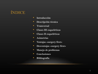El documento aborda el enfoque 'surgery first' en cirugía ortognática, donde se realiza primero la cirugía para corregir las discrepancias esqueléticas y posteriormente se ajusta la posición dental. Este método busca reducir el tiempo total de tratamiento y mejorar la estética facial desde el inicio, aunque presenta desventajas como la inestabilidad oclusal y la necesidad de un manejo cuidadoso por parte del ortodoncista. Se concluye que el 'surgery first' puede ser útil en diversos casos de asimetrías esqueléticas y alteraciones transversales, aunque requiere planificación y colaboración entre cirujanos y ortodoncistas.