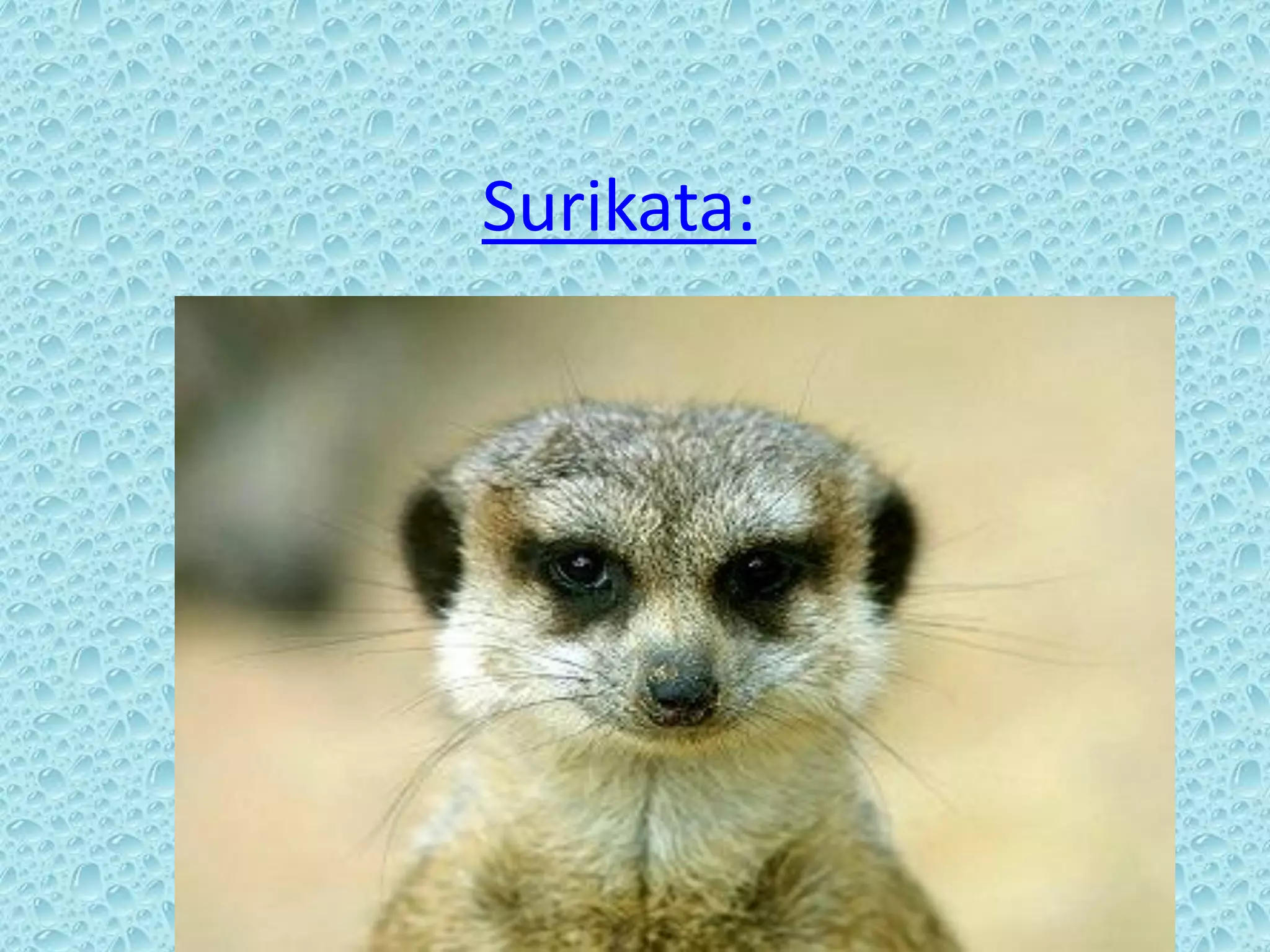 El documento describe la taxonomía, anatomía, alimentación, reproducción, comportamiento y hábitat del suricato. El suricato es un pequeño mamífero de la familia de las mangostas que vive en colonias en el desierto de Kalahari en el sur de África, busca comida en grupo y se reproduce varias veces al año.