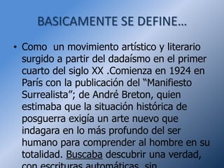 El surrealismo surgió en París en 1924 como un movimiento artístico y literario que buscaba explorar lo más profundo de la mente humana y plasmar las imágenes del subconsciente. Utilizaba técnicas como la escritura automática y el cadáver exquisito para generar obras que reflejaran los sueños y lo prohibido. Algunos de sus principales exponentes fueron los poetas André Breton y Louis Aragón.