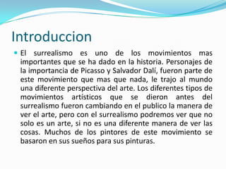 El documento resume el movimiento artístico surrealista, que surgió en Francia en la década de 1920 influenciado por el dadaísmo. Artistas como Salvador Dalí y Joan Miró plasmaban en su obra imágenes oníricas y simbólicas inspiradas en el subconsciente y los sueños. El surrealismo se expandió por Europa y llegó a México, donde Frida Kahlo y Diego Rivera incorporaron algunos de sus elementos a pesar de no considerarse estrictamente surrealistas.