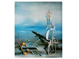 El surrealismo surgió en 1924 como una propuesta frente al dadaísmo. Se basó en el automatismo psíquico y en las teorías de Freud sobre el inconsciente. Artistas como Dalí, Miró, Masson, Ernst, Delvaux, Magritte y Tanguy crearon obras que buscaban expresar lo irracional a través de técnicas como el collage y la pintura automática, inspirándose en el sueño, lo primitivo y lo infantil. El surrealismo promovió un cambio social apoyado en la liberación del inconsciente.