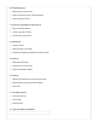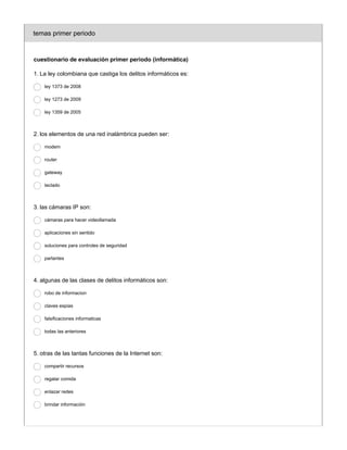 Este documento presenta un cuestionario de evaluación sobre temas de informática del primer periodo. El cuestionario contiene preguntas sobre leyes de delitos informáticos en Colombia, elementos de una red inalámbrica, funciones de cámaras IP, clases de delitos informáticos, funciones de Internet, definición de ciberacoso, significado de sexting, definición de URL, funciones de Word, definición de página web, preguntas sobre delitos informáticos y consejos para evitarlos, definición de Internet, característic