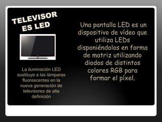 Este documento describe las diferencias entre los televisores LED y 3D. Explica que los televisores LED usan matrices de LEDs de colores RGB para formar píxeles en lugar de lámparas fluorescentes. Señala que los OLED y LED son más delgados porque iluminan toda la pantalla de una vez. También compara televisores LED de diferentes marcas y discute cómo la televisión 3D usa lentes especiales para crear la ilusión de profundidad proyectando imágenes ligeramente diferentes a cada ojo.