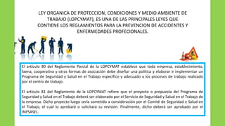 La ley orgánica de protección, condiciones y medio ambiente de trabajo (LOPCYMAT) establece los reglamentos para establecer un programa de prevención de accidentes y enfermedades profesionales que incluye normas sobre medicina del trabajo, ergonomía, seguridad e higiene, así como procedimientos para identificar riesgos, educar trabajadores, y monitorear la salud y seguridad ocupacional.