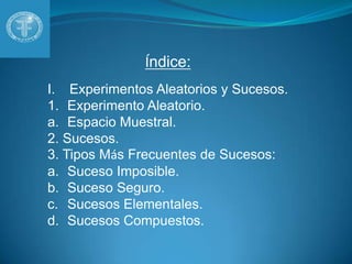 Este documento describe conceptos básicos de experimentos aleatorios y sucesos. Define un experimento aleatorio como uno que puede dar varios resultados impredecibles. Explica que un suceso es cada subconjunto del espacio muestral de resultados posibles. Describe cuatro tipos comunes de sucesos: sucesos imposibles, seguros, elementales y compuestos. Concluye que los experimentos aleatorios producen múltiples variables de datos posibles.
