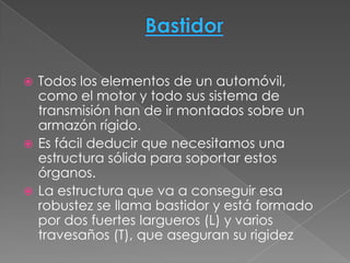 El bastidor de un automóvil está formado por dos largueros y varios travesaños que aseguran su rigidez, soportando todos los elementos del vehículo como el motor y la transmisión. Los muelles de suspensión absorben las fuerzas del rebote del vehículo para eliminar las oscilaciones, y los amortiguadores controlan el número y amplitud de las oscilaciones producidas por las irregularidades de la carretera.