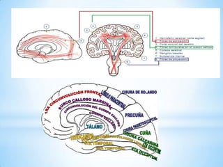 Este documento describe la configuración interna del centro medular o sustancia blanca del cerebro. Explica que está compuesta por fibras mielínicas de diferentes diámetros soportadas por neuroglia, las cuales pueden ser fibras comisurales, de asociación o de proyección. También describe las principales estructuras que componen el cuerpo calloso y otras comisuras, así como las cápsulas interna, externa y extrema que contienen fibras de proyección.
