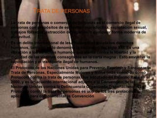 El documento trata sobre la trata de personas y su definición. Es el comercio ilegal de personas con fines de esclavitud, explotación sexual u otros trabajos forzados, y viola los derechos humanos. El Protocolo de Palermo de 2000 es un acuerdo internacional para prevenir, reprimir y sancionar la trata de personas.