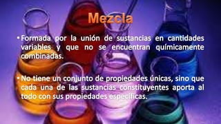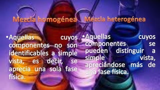 El documento clasifica y describe varias sustancias comunes, incluyendo la mayonesa, el agua potable, la leche, el alcohol, el perfume, el vinagre, las bebidas gaseosas, la sangre, la pintura y el merengue. Proporciona información sobre cómo se clasifican, de qué están hechas, cómo se fabrican y otros detalles relevantes sobre cada sustancia.
