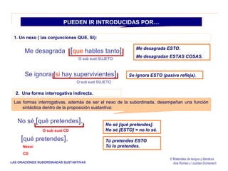 Este documento explica las oraciones subordinadas sustantivas, que equivalen a un sustantivo y pueden desempeñar funciones como sujeto, atributo o complemento directo. Estas oraciones van introducidas por un nexo como "que" o "si", formas interrogativas o un infinitivo, y son conmutables por un pronombre demostrativo neutro como "esto", "eso" o "aquello". Además, señala que una preposición que precede al nexo o infinitivo forma parte de la subordinada sustantiva solo si entra dentro de la secuencia con