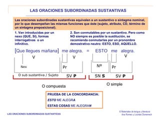 Este documento describe las oraciones subordinadas sustantivas. Estas oraciones equivalen a un sustantivo y pueden desempeñar funciones como sujeto, atributo o complemento directo. Pueden introducirse por nexos como "que" o "si", formas interrogativas o infinitivos. Siempre son conmutables por un pronombre demostrativo neutro como "esto", "eso" o "aquello".