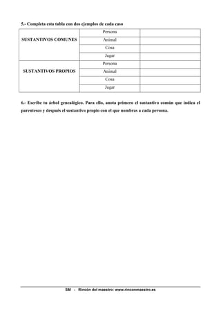 Este documento explica los sustantivos comunes y propios. Los sustantivos comunes nombran personas, animales, cosas o lugares de forma general, mientras que los sustantivos propios se refieren de forma específica a un individuo. El documento proporciona ejercicios para identificar y clasificar sustantivos comunes y propios en diferentes contextos.