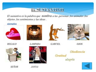 El documento clasifica y define diferentes tipos de sustantivos. Explica que los sustantivos propios se refieren específicamente a individuos u objetos, mientras que los sustantivos comunes designan categorías en forma general. También describe sustantivos abstractos, concretos, contables, no contables, individuales, colectivos, derivados y primitivos, dando ejemplos de cada tipo.