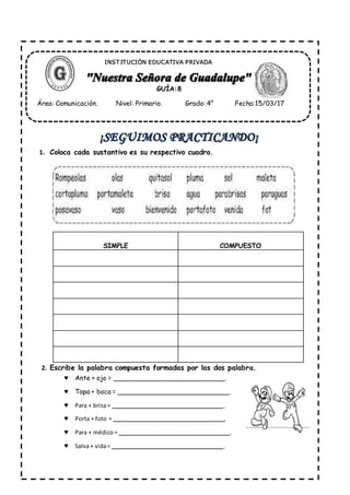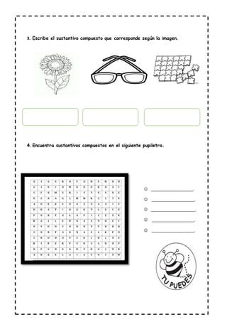 El documento instruye al estudiante a dividir sustantivos en cuadros, formar palabras compuestas uniendo dos sustantivos, identificar sustantivos compuestos en imágenes y en un texto. Se proporcionan ejemplos de palabras compuestas como "anteojo", "tapaboca", "parabrisas", "portafoto" y "paramédico" y se pide al estudiante completar actividades relacionadas con palabras compuestas.