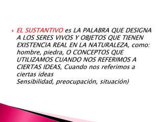 El documento define los diferentes tipos de sustantivos, incluyendo sustantivos propios, comunes, abstractos, concretos, contables, no contables, individuales, colectivos, derivados y primitivos. Proporciona ejemplos de cada tipo de sustantivo para ilustrar sus definiciones.