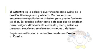 Este documento define el sustantivo como la palabra que funciona como sujeto de la oración y puede tener género y número. Explica que los sustantivos pueden ser propios o comunes, simples o compuestos, primitivos o derivados, concretos o abstractos, e individuales o colectivos. Además, detalla que los sustantivos tienen género masculino o femenino y pueden ser ambiguos dependiendo del contexto.