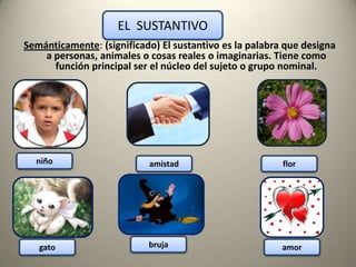 Este documento describe las características semánticas y morfológicas del sustantivo. Semánticamente, el sustantivo designa personas, animales o cosas reales o imaginarias y sirve como núcleo del sujeto o grupo nominal. Morfológicamente, el sustantivo es variable y cambia su forma para indicar género y número. Explica que los sustantivos pueden ser comunes, propios, concretos, abstractos o gentilicios.
