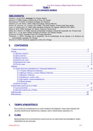 El documento trata sobre los grandes biomas y sus características fundamentales, así como los problemas ambientales que enfrentan. Se abordan temas como el clima, variaciones climáticas a lo largo de la historia de la Tierra, y la relación entre clima y biomas. Además, incluye una extensa bibliografía y referencias sobre ecología y ciencias medioambientales.