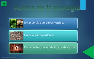 El documento describe varios desafíos ambientales, sociales y económicos, así como estrategias para prevenir la contaminación. Entre los desafíos ambientales se encuentran evitar la pérdida de biodiversidad, no devastar ecosistemas y frenar la destrucción de la capa de ozono. Las estrategias de prevención incluyen usar energías renovables, sistemas de irrigación eficientes, reciclar basura y chequear pérdidas de agua.