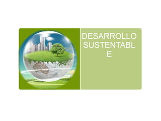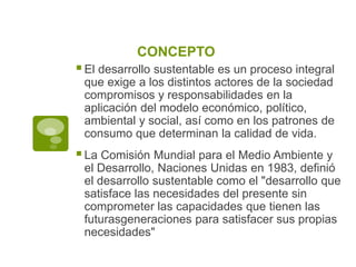 El documento define el desarrollo sustentable como un proceso que satisface las necesidades del presente sin comprometer las capacidades de las futuras generaciones. Explica que implica compromisos en los ámbitos económico, político, ambiental y social, así como en los patrones de consumo. Identifica siete dimensiones de la sustentabilidad: económica, ecológica, energética, social, cultural, científica. Finalmente, señala que el desarrollo sustentable se basa en tres pilares: económico, social y ambient