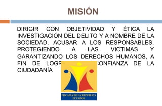 Este documento presenta la misión y la estructura organizacional de la Fiscalía Provincial de Santa Elena. La misión es dirigir con objetividad y ética la investigación de delitos para acusar a los responsables, proteger a las víctimas y garantizar los derechos humanos con el fin de ganar la confianza de la ciudadanía. Se detalla la función de cada cargo como el Fiscal Provincial, Secretario Provincial, Analista de Gestión Administrativa y Financiera, Asistente de Fiscales y roles de apoyo como Médico Legista, Chofer y