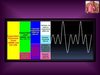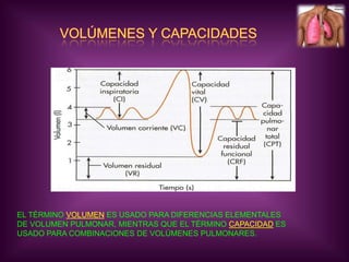 Este documento describe los volúmenes y capacidades pulmonares, incluyendo el volumen corriente, volumen de reserva inspiratoria, volumen de reserva espiratoria, volumen residual, capacidad vital, capacidad funcional residual y capacidad pulmonar total. También explica los patrones espirométricos normales, obstructivos, restrictivos y mixtos, y cómo la espirometría se utiliza para diagnosticar enfermedades pulmonares.