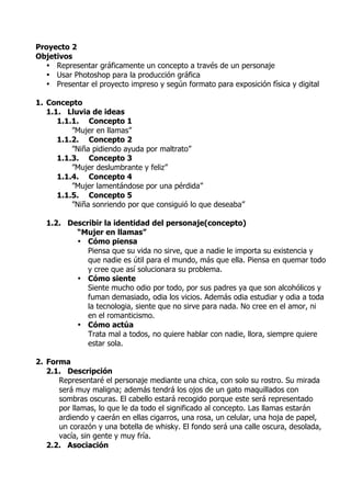 Este documento presenta el proyecto 2 de fotomontaje de un personaje para un curso de introducción a los medios digitales. El proyecto implica representar gráficamente un concepto a través de un personaje usando Photoshop. El concepto elegido es "Mujer en llamas" y se describen los pensamientos, sentimientos y acciones de este personaje. Se detalla la forma en que será representado mediante el rostro de una mujer con ojos de gato maquillados y cabello en llamas, con objetos quemándose. Se explica la insp