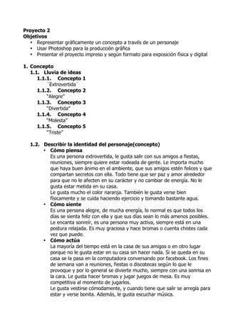 Este documento describe un proyecto de fotomontaje de un personaje para un curso de introducción a los medios digitales. El proyecto implica representar gráficamente un concepto ("alegre") a través de un personaje usando Photoshop. Se detalla el proceso de desarrollo incluyendo la generación de ideas, la descripción del personaje, las asociaciones visuales y elementos que lo representan, y las etapas de producción como la toma de fotos y el fotomontaje en Photoshop.