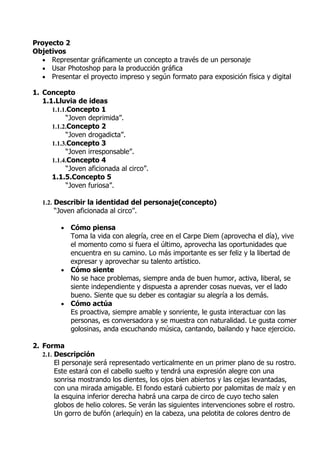 Este documento presenta un proyecto de fotomontaje de un personaje que representa a una "Joven aficionada al circo". El proyecto tiene como objetivos representar gráficamente un concepto a través de un personaje y usar Photoshop para la producción gráfica. Se describe al personaje como una joven alegre que aprecia la vida y se siente libre expresando su talento artístico en el circo. El fotomontaje mostrará el rostro de la joven con varios elementos que representan su personalidad, como un gorro de bufón y