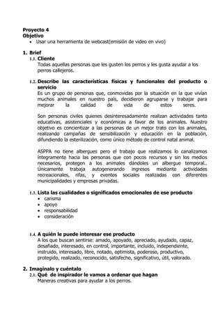 Este documento presenta un proyecto de webcast sobre una organización que ayuda a perros callejeros. El webcast incluirá una presentación de la organización, una entrevista con una voluntaria sobre su experiencia ayudando a los perros, y conclusiones con ideas para ayudar y formar parte de la organización. El objetivo es crear conciencia sobre la situación de los perros callejeros y cómo la comunidad puede apoyarlos.