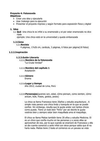 Este documento presenta un proyecto de creación de una fotonovela usando InDesign. La historia trata sobre una chica llamada Francesca que le es infiel a su novio Matías repetidamente a pesar de que él la ama. El proyecto incluye la idea conceptual de la historia, los personajes, el guión literario dividido en capítulos, y un storyboard para la producción visual de la fotonovela en InDesign. El objetivo es crear e implementar la idea y presentar el proyecto impreso y digitalmente.