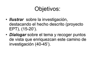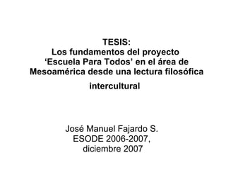 El documento describe el proyecto "Escuela Para Todos" (EPT) en Mesoamérica. EPT es un programa educativo radial transmitido en 60 emisoras desde los años 1960 por el Instituto Centroamericano de Extensión de la Cultura. El programa educa a personas en áreas rurales que no tuvieron educación formal a través de programas de radio, correspondencia con oyentes, y un libro anual. El documento analiza la metodología intercultural del proyecto y concluye que EPT fue una de las experiencias educativas más significativas e intercultural