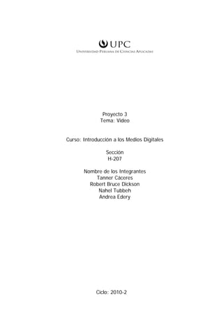 Este documento presenta el proyecto 3 de un curso de Introducción a los Medios Digitales. El proyecto involucra la producción de un video expresando el refrán "Quien mal anda mal termina". El video sigue la historia de un joven llamado Carlos que aparenta llevar una vida estudiosa ante su familia pero en realidad se involucra con drogas y alcohol. El video es producido usando Adobe Premiere y presenta un guión literario, storyboard y guión técnico. El objetivo es expresar el significado del refrán a trav
