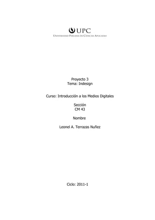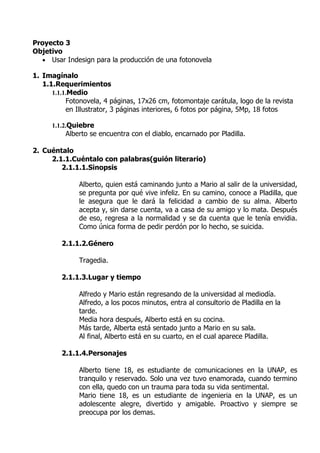Este documento presenta un proyecto en InDesign sobre una fotonovela. La historia trata sobre un estudiante llamado Alberto que se encuentra infeliz y conoce a un hombre llamado Pladilla que le ofrece felicidad a cambio de su alma. Al aceptar, Alberto termina asesinando a su amigo Mario. Después se da cuenta de lo que hizo y se suicida. El proyecto incluye requisitos, sinopsis, género, personajes y un guión literario detallado de la historia.