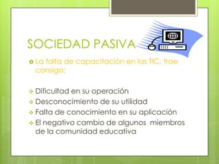 El documento describe los rasgos de una sociedad pasiva y cómo la falta de capacitación en tecnologías de la información y comunicación (TIC) puede conducir a dificultades en su operación, desconocimiento de su utilidad y falta de conocimiento en su aplicación. También señala que es necesario que la comunidad educativa esté actualizada en el uso y manejo de las TIC para proveer a los alumnos de las herramientas necesarias para el siglo actual.